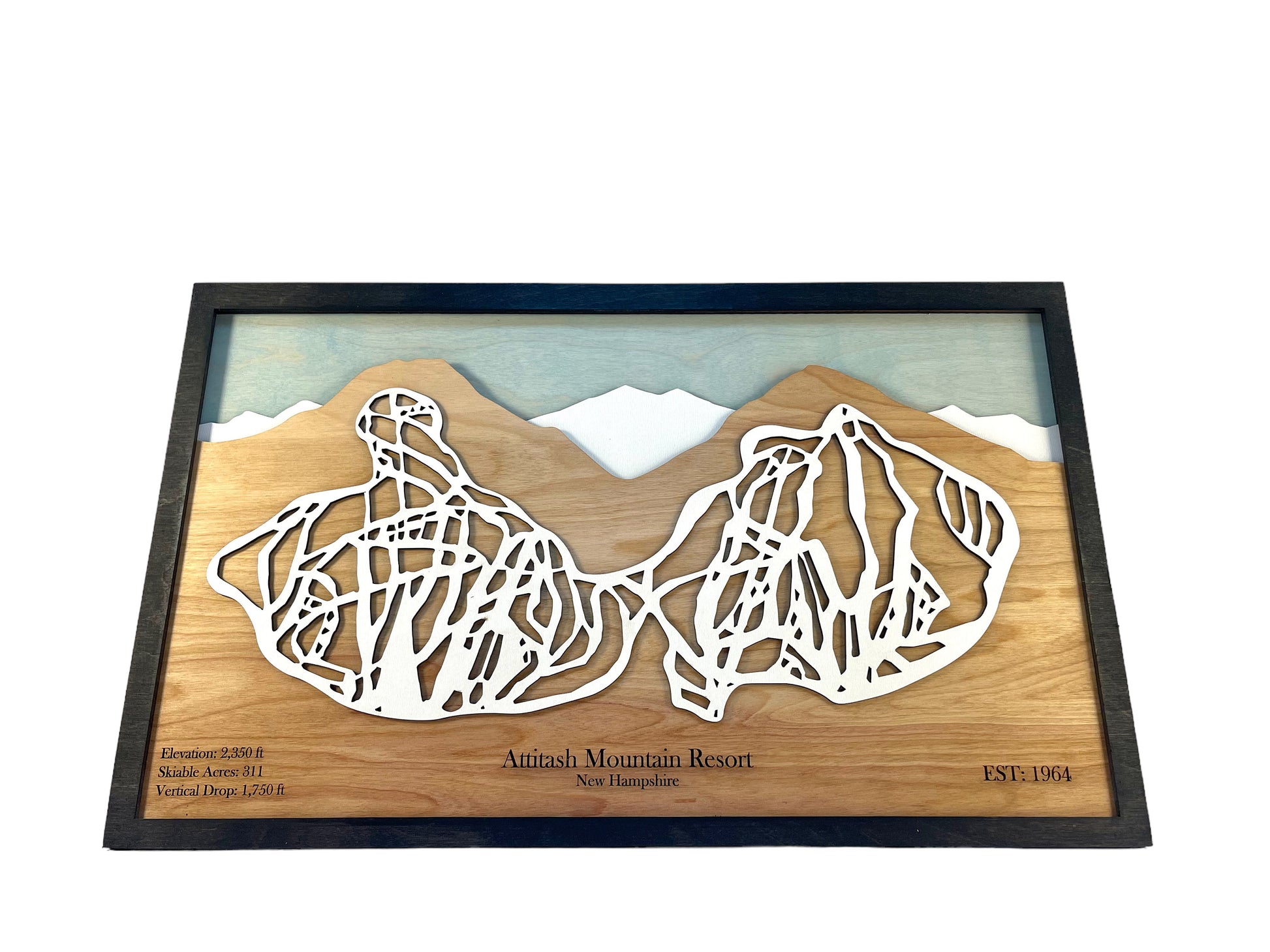This 3D ski map is perfect for skiers and snowboarders who love Attitash! This map is four layers of laser cut and engraved wood featuring key details of Attitash Mountain Resort in New Hampshire. The trails and mountains are stained wood. The laser cut wood provides a unique depiction of the resorts trails making it an eye-catching piece that looks amazing on any wall. Engravings include the mountains elevation, skiable acres, the year it was established and vertical drop. Be sure to check all of the photos to see the amazing details that this mountain offers!