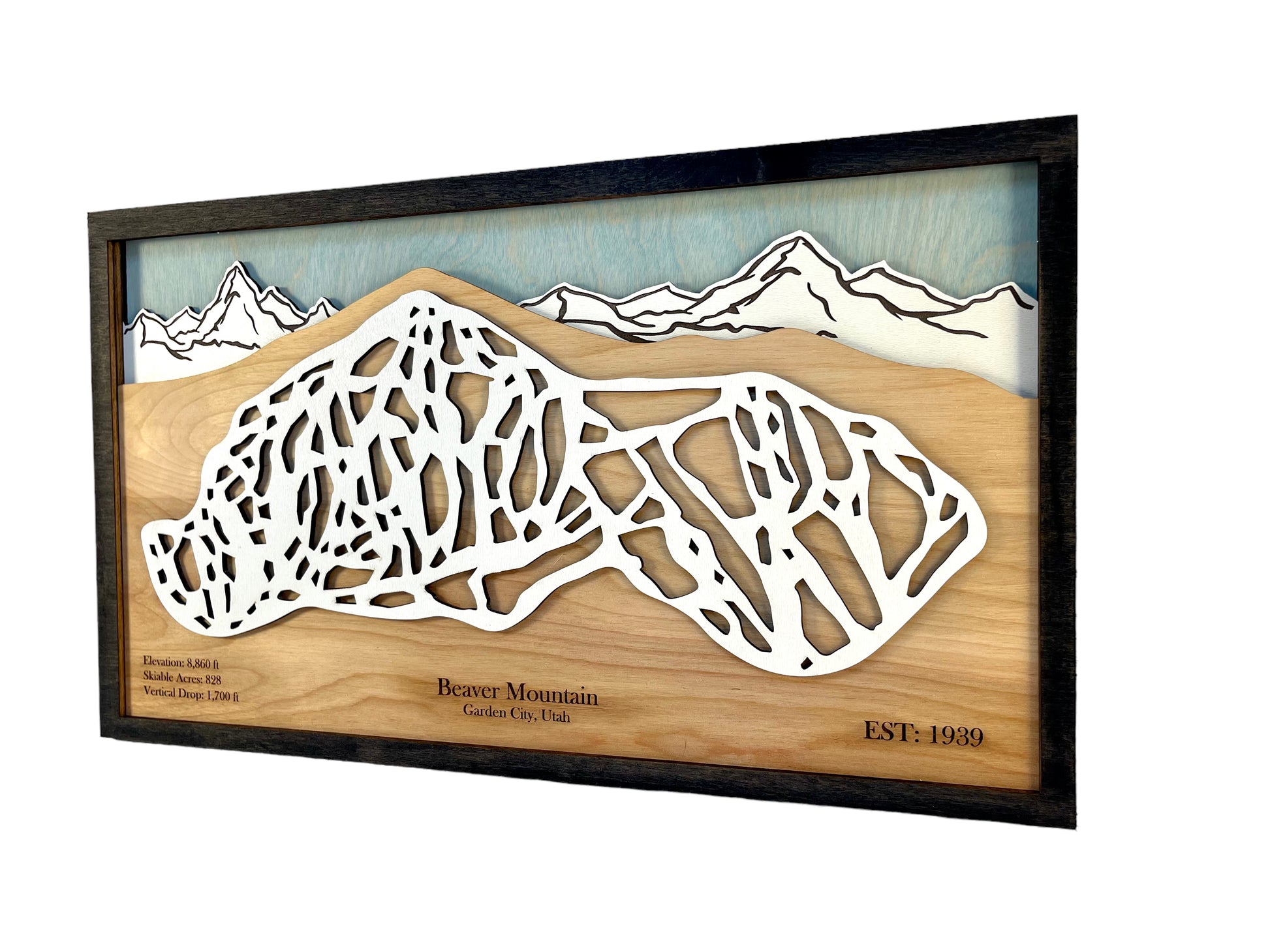 This 3D ski map is perfect for skiers and snowboarders who love Beaver Mountain! This map is four layers of laser cut and engraved wood featuring key details of Beaver Mountain in Garden City, Utah. The trails, mountains, and sky are stained wood. The laser cut wood provides a unique depiction of the resorts trails making it an eye catching piece that looks amazing on any wall.