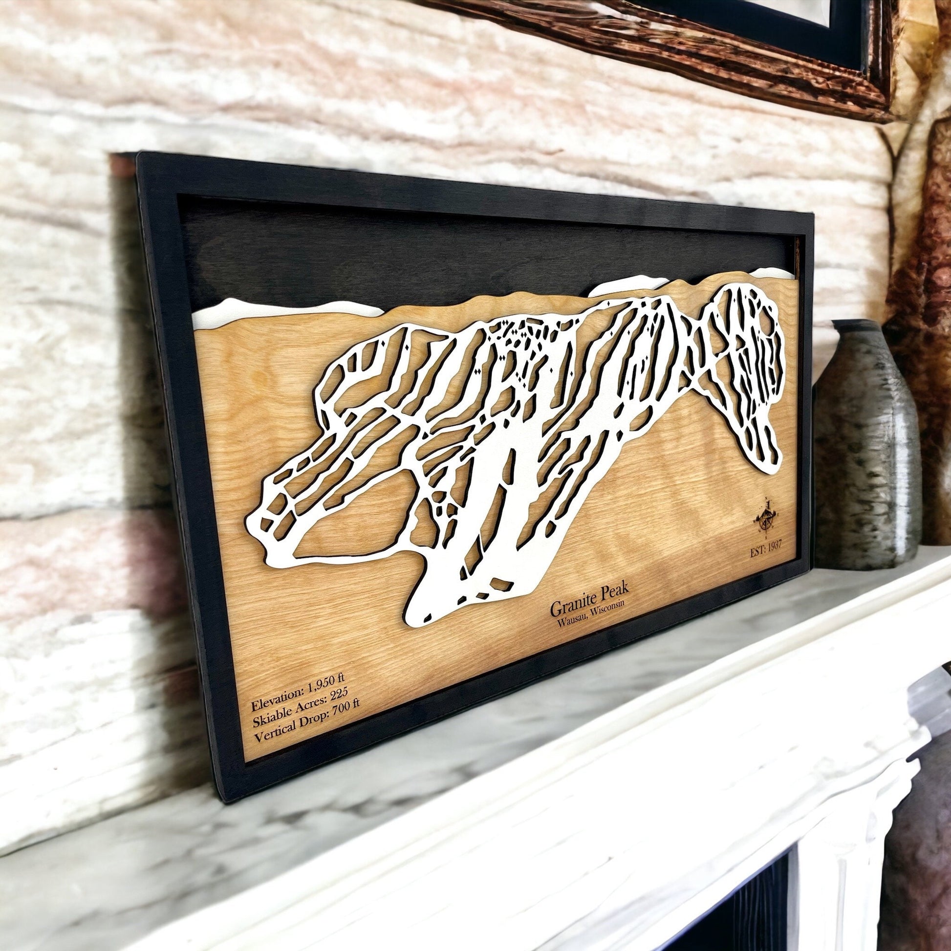 This 3D ski map is perfect for skiers and snowboarders who love Granite Peak Ski Resort! This map is four layers of laser cut and engraved wood featuring key details of Granite Peak in Wausau, Wisconsin. The trails, mountains, and sky are stained wood. The laser cut wood provides a unique depiction of the resorts trails making it an eye-catching piece that looks amazing on any wall.