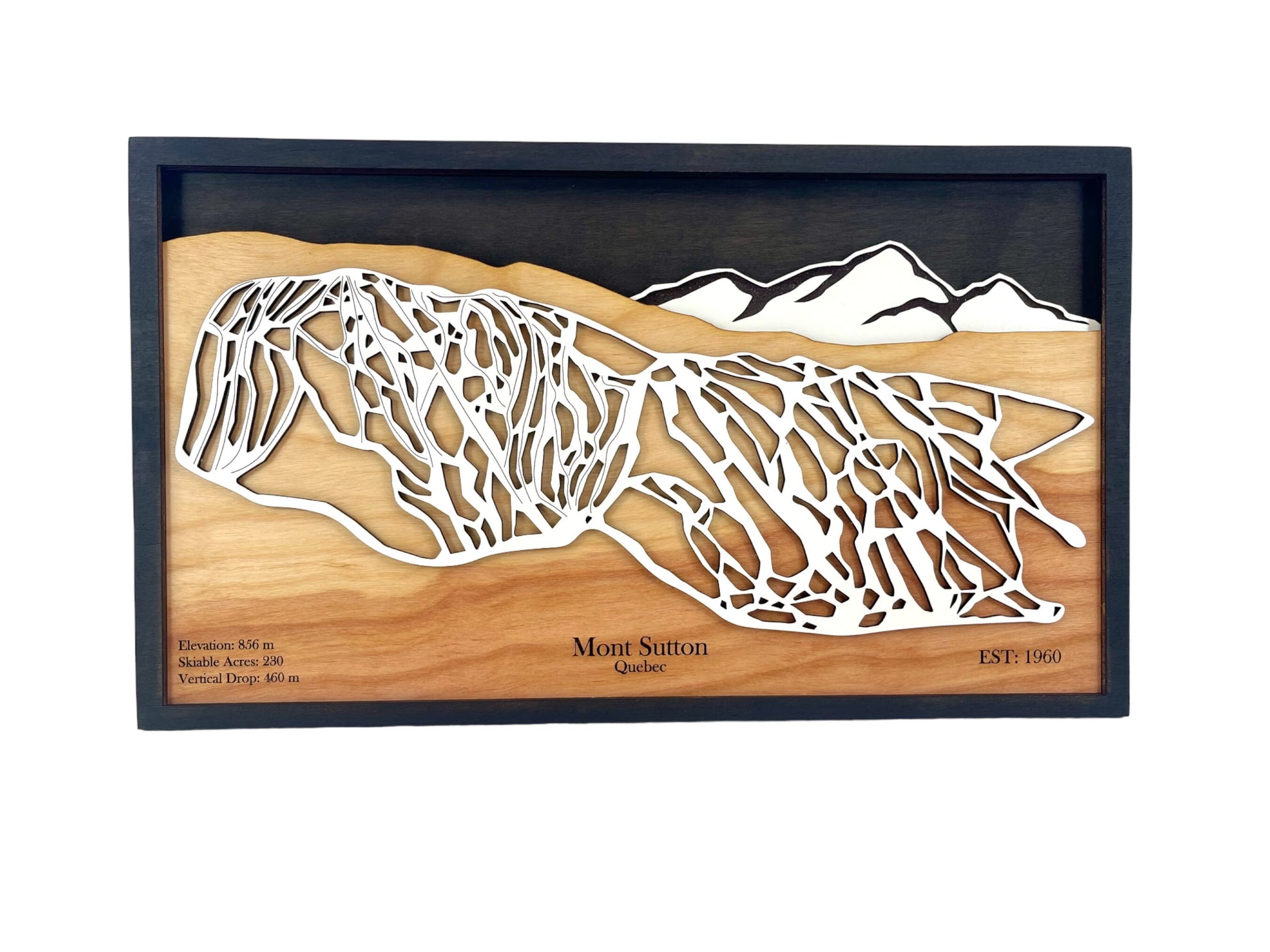 This 3D ski map is perfect for skiers and snowboarders who love Mont Sutton! This map is four layers of laser cut and engraved wood featuring key details of Mont Sutton Ski Resort in Quebec, Canada. The trails and mountains are stained wood. The laser cut wood provides a unique depiction of the resorts trails making it an eye-catching piece that looks amazing on any wall. Engravings include the mountains elevation, skiable acres, the year it was established and vertical drop. Be sure to check all of the photos to see the amazing details that this mountain offers!