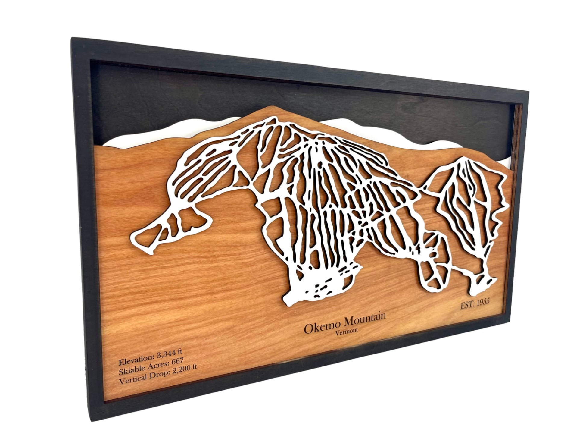 This 3D ski map is perfect for skiers and snowboarders who love Okemo! This map is four layers of laser cut and engraved wood featuring key details of Okemo Mountain in Ludlow, VT. The lake is hand painted while the trails, mountains, and sky are stained. The laser cut wood provides a unique depiction of the resorts trails making it an eye catching piece that looks amazing on any wall.