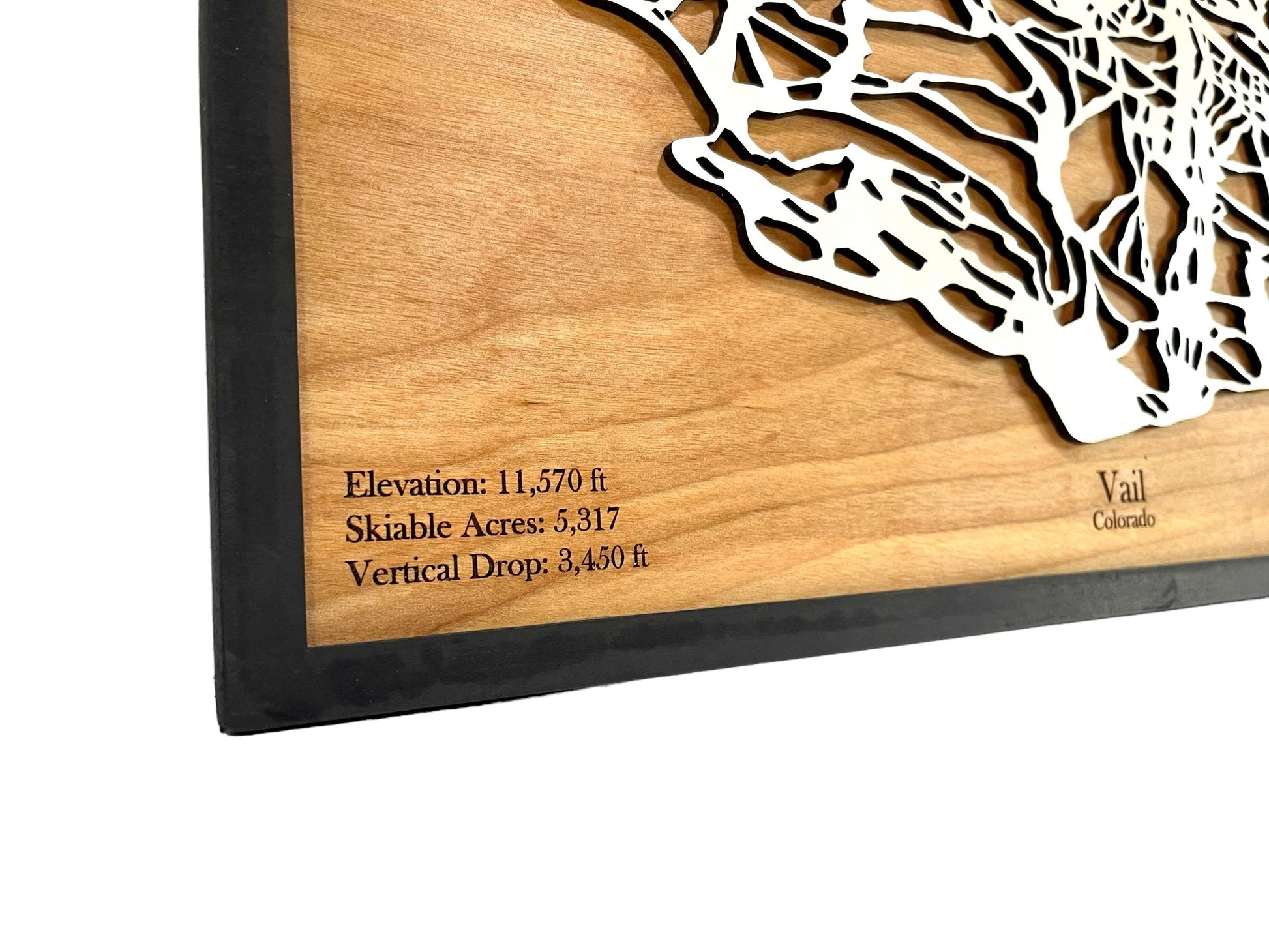 The 3D ski map is perfect for skiers and snowboarders who love Vail, CO. This map is four layers of laser cut and engraved wood featuring key details of Vail Mountain Resort. The rivers are hand pained while the trails, mountains, and sky are stained. The laser cut wood provides a unique depiction of the mountain's trails making it an eye catching piece that looks amazing on any wall.