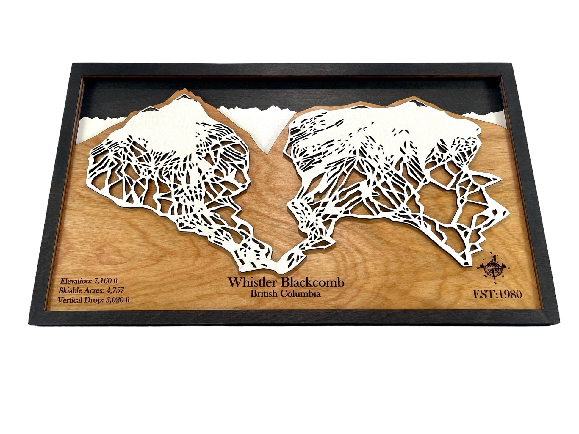 This 3D ski map is perfect for skiers and snowboarders who love Whistler-Blackcomb Resort! This map is four layers of laser cut and engraved wood featuring key details of Whistler-Blackcomb in British Columbia. The trails and mountains are stained wood. The laser cut wood provides a unique depiction of the resorts trails making it an eye-catching piece that looks amazing on any wall. Engravings include the mountains elevation, skiable acres, the year it was established and vertical drop. Be sure to check all of the photos to see the amazing details that this mountain offers!